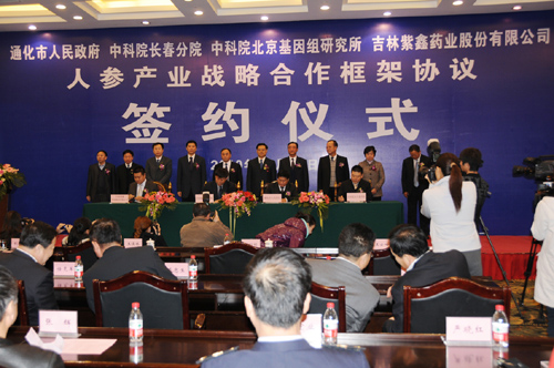 11月11日,中國科學院北京基因組研究所與通化市人民政府,中科院長春分院,吉林紫鑫藥業股份有限公司,在長春共同了簽署了“人參產業戰略合作框架協議”。吉林省省長王儒林出席了簽約儀式,會議由通化市市長田玉林主持。