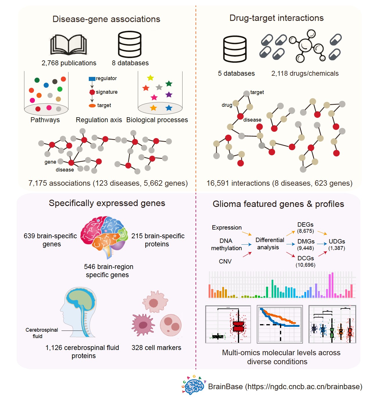 為促進腦疾病知識整合、組學數據挖掘與再利用,國家生物信息中心研究團隊開發BrainBase知識庫,致力于提供腦疾病-基因關聯知識及藥物-基因互作信息,鑒定腦“特異”表達基因,挖掘膠質瘤的特征基因并提供多組學數據可視化圖譜,為揭示腦疾病的發生發展機制提供重要的數據資源。基于2,768篇已發表文章的文獻審編和公共數據庫的信息提取,整合了123種腦疾病的7,175條疾病-基因關聯信息,2,118種藥物/化合物與623個基因的16,591條藥物-靶點互作信息,鑒定了在腦組織、腦區域、腦脊液、腦細胞水平上的“特異”表達基因。此外,考慮到膠質瘤具有致死率高、預后差、復發率高等特點,BrainBase整合21套公開發表的膠質瘤多組學數據集,分析挖掘不同組學層面、膠質瘤類型、臨床組別、生存差異的關聯信息,提供多場景多維度的基因分子特征可視化圖譜,鑒定4組具有重要臨床指導意義的特征基因,并通過建立結構化審編模型和受控詞表,對已發表的膠質瘤高質量文章進行了詳細的多組學水平注釋和描述。