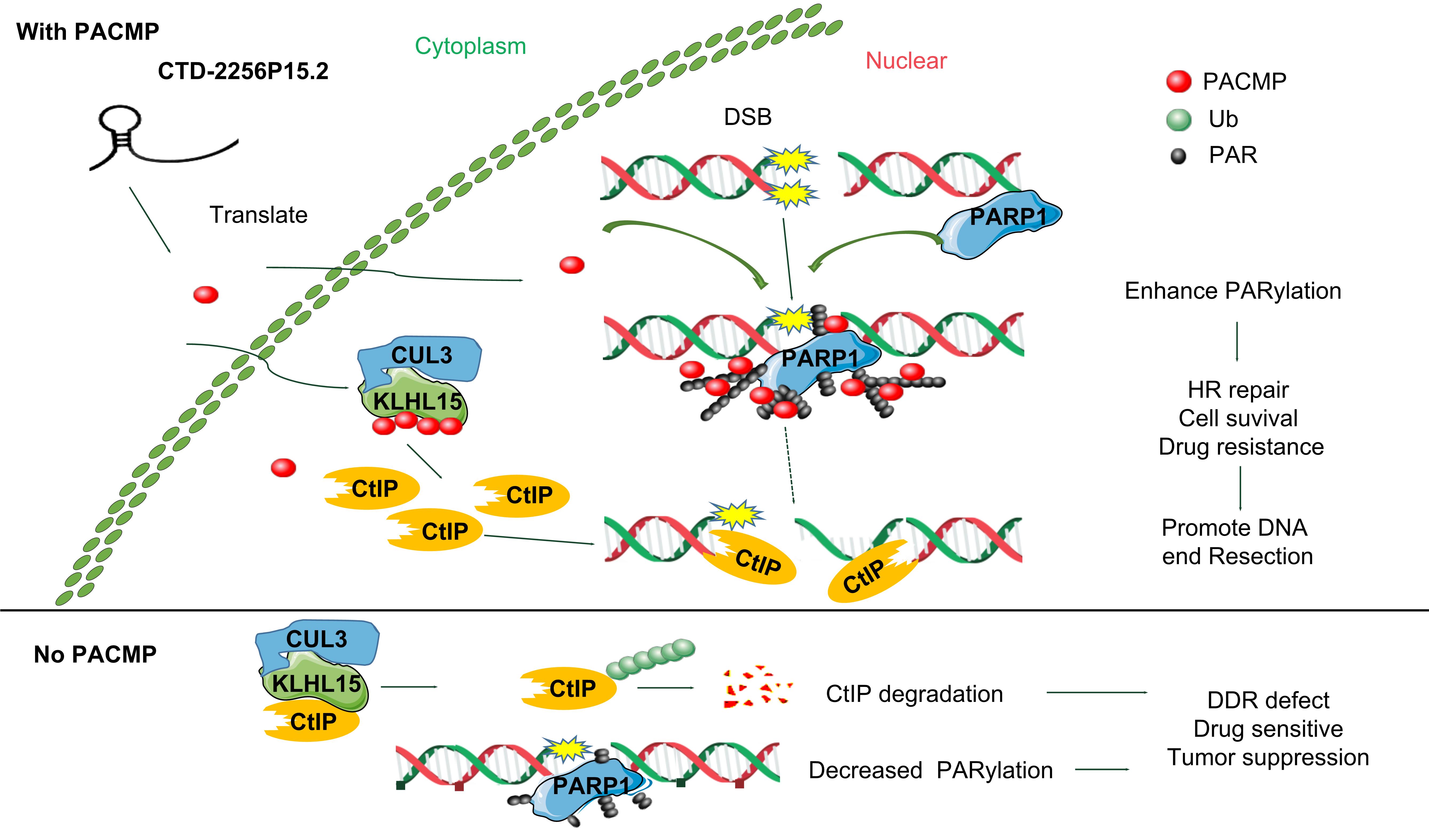 該研究發現lnc15.2能夠促進乳腺癌等多種腫瘤細胞對表阿霉素的耐藥,表達水平與病人的生存期負相關。并且證實lnc15.2是通過PACMP小肽而不是其RNA轉錄本發揮功能。PACMP通過與CtIP競爭性結合泛素連接酶Cullin3的底物銜接子KLHL15來抑制CtIP的泛素化和蛋白酶體依賴的降解,促進DNA同源重組修復;PCAMP還直接結合PAR鏈,通過其帶有的正電荷來中和PAR鏈的負電荷,促進PARP1催化的PAR鏈延伸。單獨靶向lnc15.2/PCAMP能顯著抑制腫瘤細胞生長,其效果類似于同時敲低PARP1和CtIP;靶向lnc15.2/PCAMP還能促進腫瘤細胞對放療、化療(喜樹堿、表阿霉素)、靶向治療(PARPi、ATR以及CDK4/6抑制劑)等多種藥物的敏感性,可明顯改善腫瘤療效。