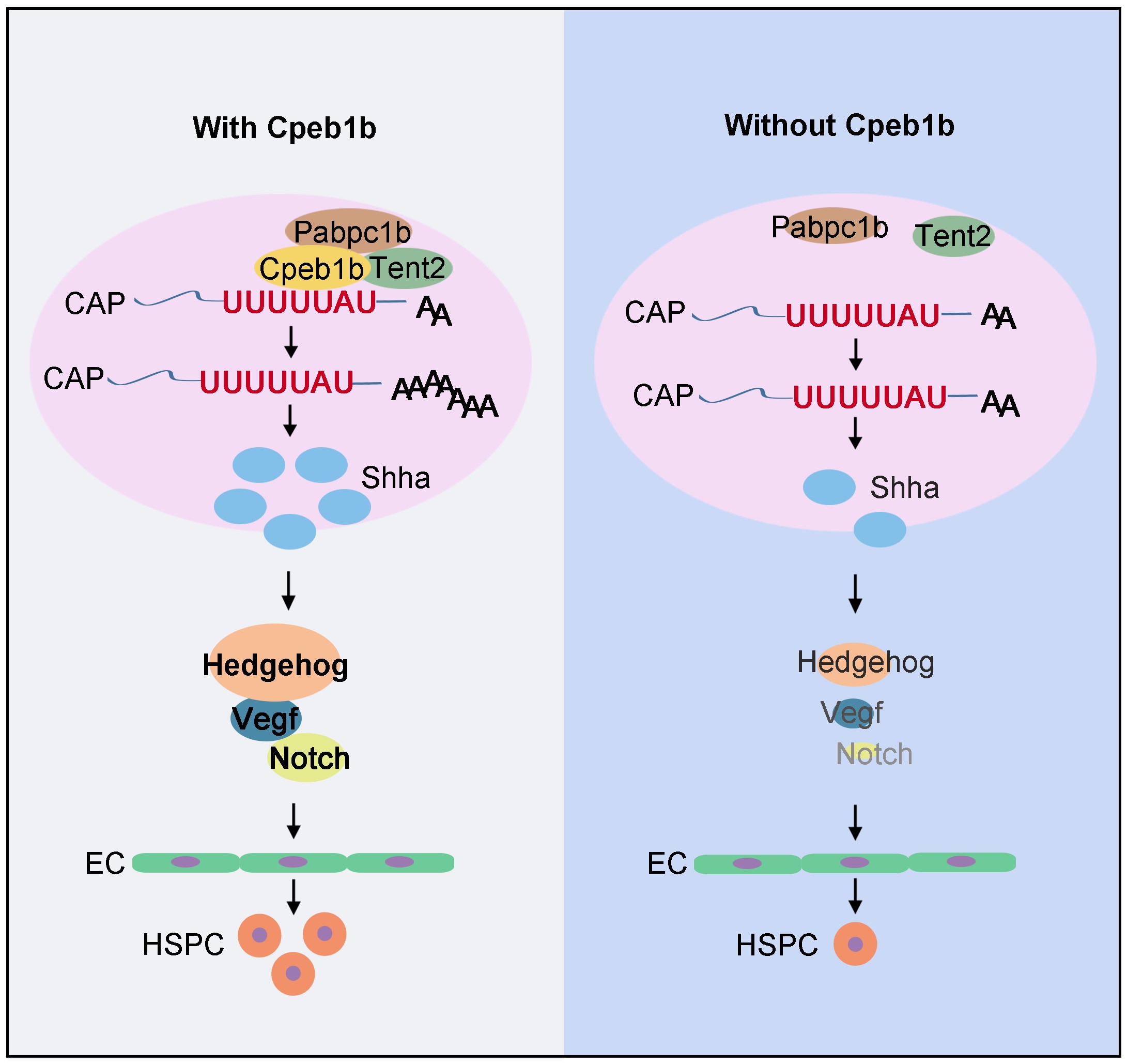 綜上所述,該研究發現在斑馬魚早期胚胎發育過程中,Cpeb1b介導的shha mRNA胞質多聚腺苷酸化能增強其翻譯效率,從而提高Shha蛋白水平。Shha蛋白通過激活Hedgehog-Vegf-Notch信號軸來促進生血內皮細胞的特化,進而維持正常的HSPC產生過程。這些發現為解析信號通路如何被精確調控并指導內皮細胞進行內皮-造血的命運轉變提供新的線索。