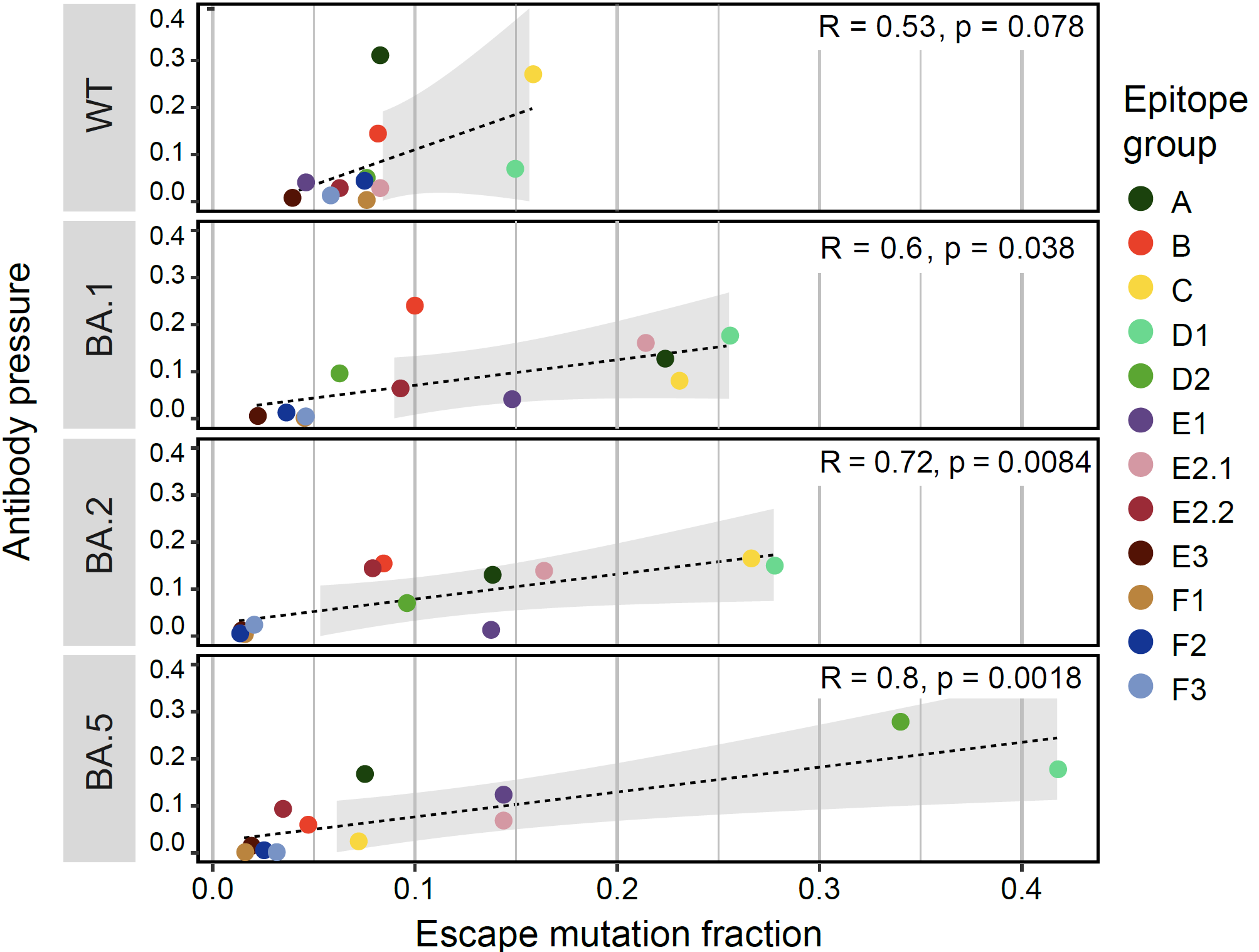 該研究對2019年至2022年的600萬條新冠病毒基因組進行了分析。研究發現,除了埃爾法(Alpha)和奧密克戎(Omicron)變異株出現帶來的突變數目劇烈升高外,新冠病毒基因組進化速率基本保持穩定。然而,隨著時間的推移,新增突變逐漸集中在受體結合區域(RBD),導致該區域的進化速率加快。同時,研究發現RBD區域的突變呈現出明顯的株系特征,即有近似RBD序列的變異株傾向發生相同的突變,而這種特征在RBD以外的基因組區域未觀察到。隨后,研究使用了深度突變掃描技術(Deep Mutation Screening)數據來評估新冠病毒RBD區域不同突變的免疫逃逸力。分析發現,不同病毒株系發生的突變逃逸的抗體類型存在明顯差異,并且不同抗原表位受到的抗體免疫壓力與該區域內發生免疫逃逸的頻率呈正相關。隨著時間的推移,這種相關性不斷增強(在BA.5變異株中的皮爾遜相關系數為0.8),這表明人群中由疫苗接種和自然感染引起的免疫壓力可能是近期新冠病毒進化的主要驅動力。