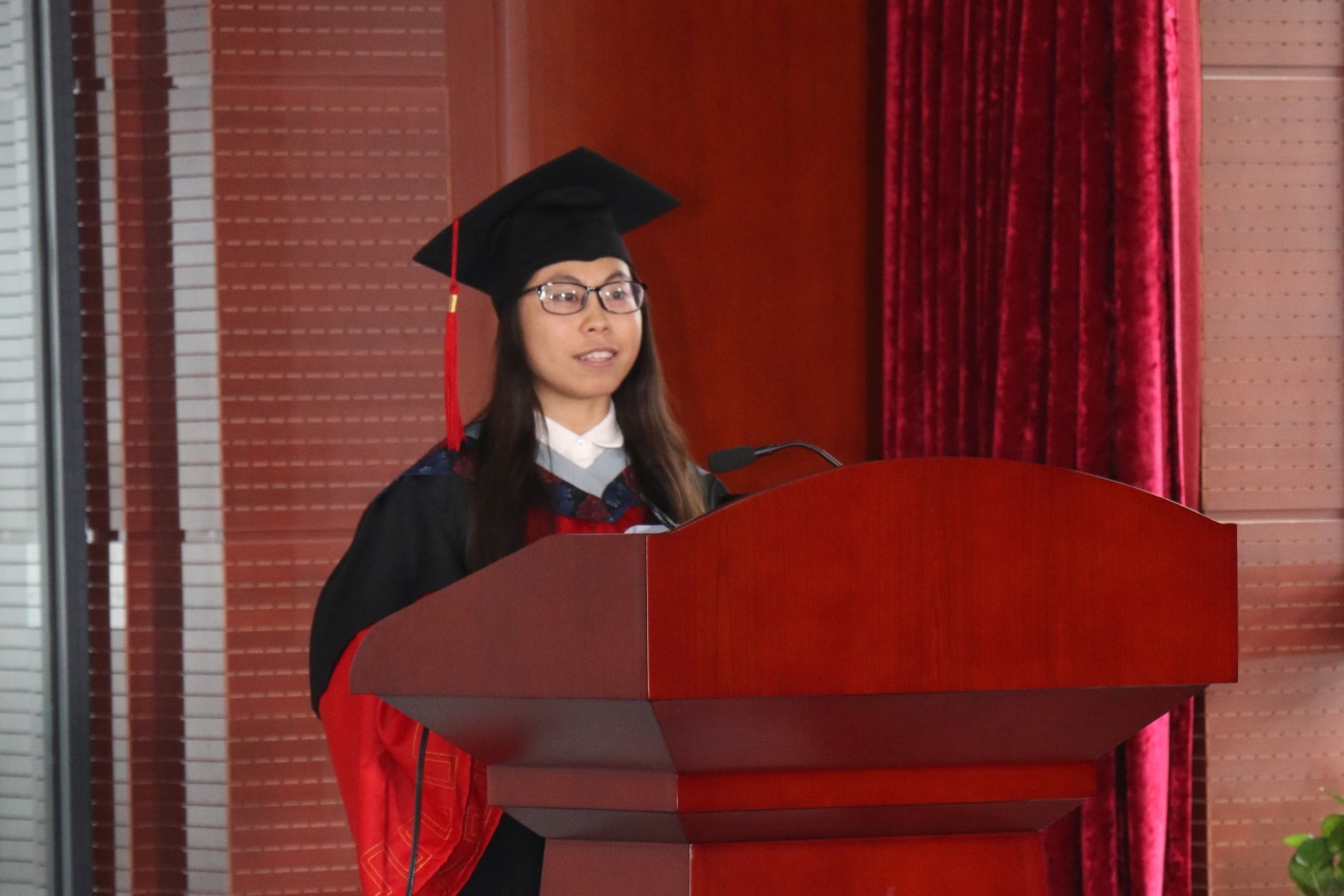 接著,呂雪梅研究員作為導師代表發言。她首先代表全體導師對畢業生為人類科學事業發展所做的努力和奉獻表示感謝;其次,她倡導畢業生思考人生重要的幾個問題:關于生,包括生命、生活和人生目標;關于欲,包括愛恨情仇,名譽、物欲、利欲;希冀大家在追求人生目標時學會把握好生活節奏和人生心態,在面對競爭和選擇時,多從獲得美感和快樂的角度進行思考;最后,她以詩歌《不要溫和地走進那個良夜》作為結尾,希望大家對生命心存敬畏和激情,并真誠地祝愿畢業生擁有幸福美滿的人生。