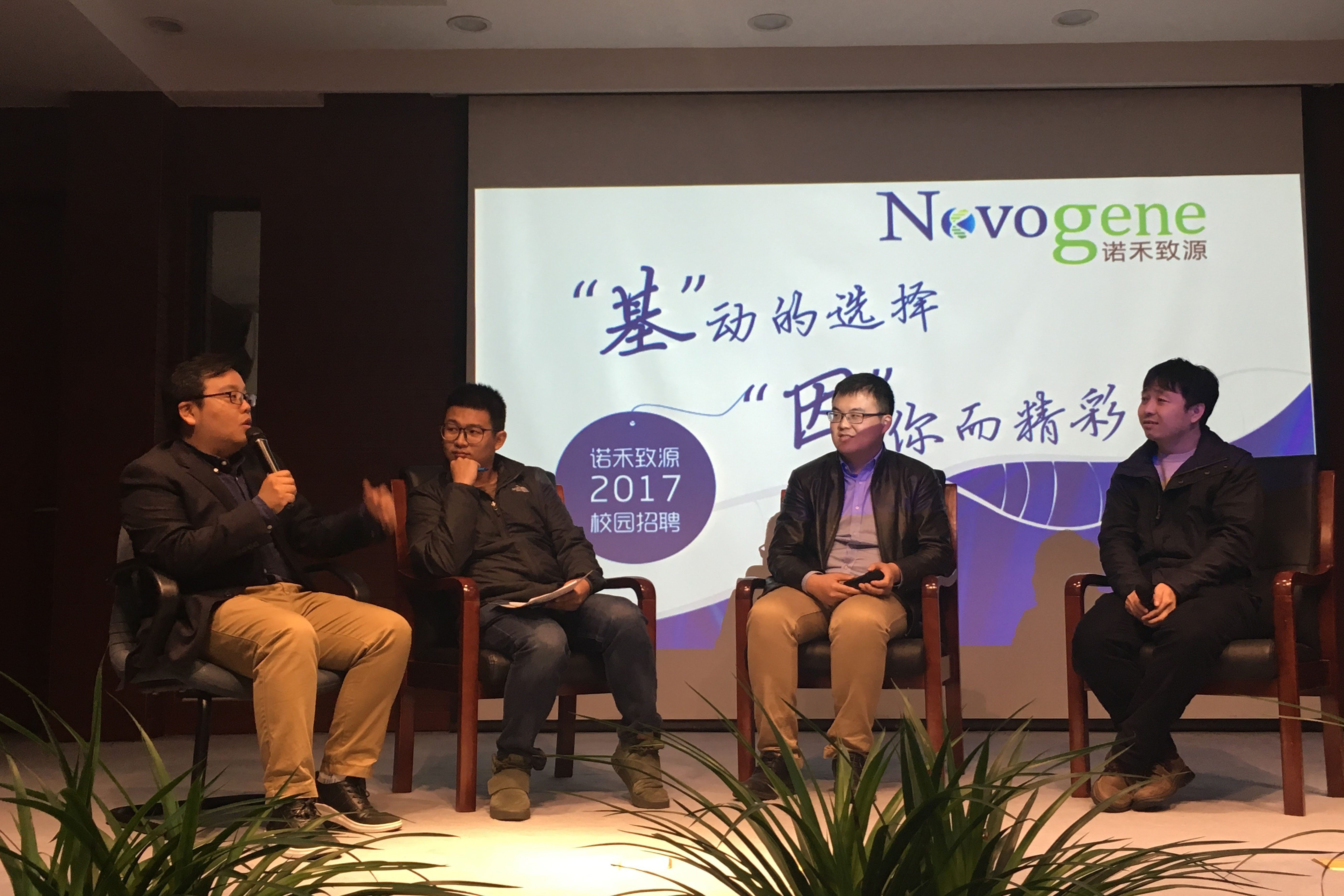 隨后,研究所團委書記徐磊老師,研究生會主席陳宇晟博士與諾禾致源兩位高管共同上臺,大家坐到一起展開暢談,主題涉及奧巴馬提出精準醫療的概念,精準醫療目前在以諾禾致源為代表的生物科技企業的發展模式、臨床應用、市場前景及政策環境等,并與現場的同學們充分互動,多位研究生就自己關心的問題進行提問交流。