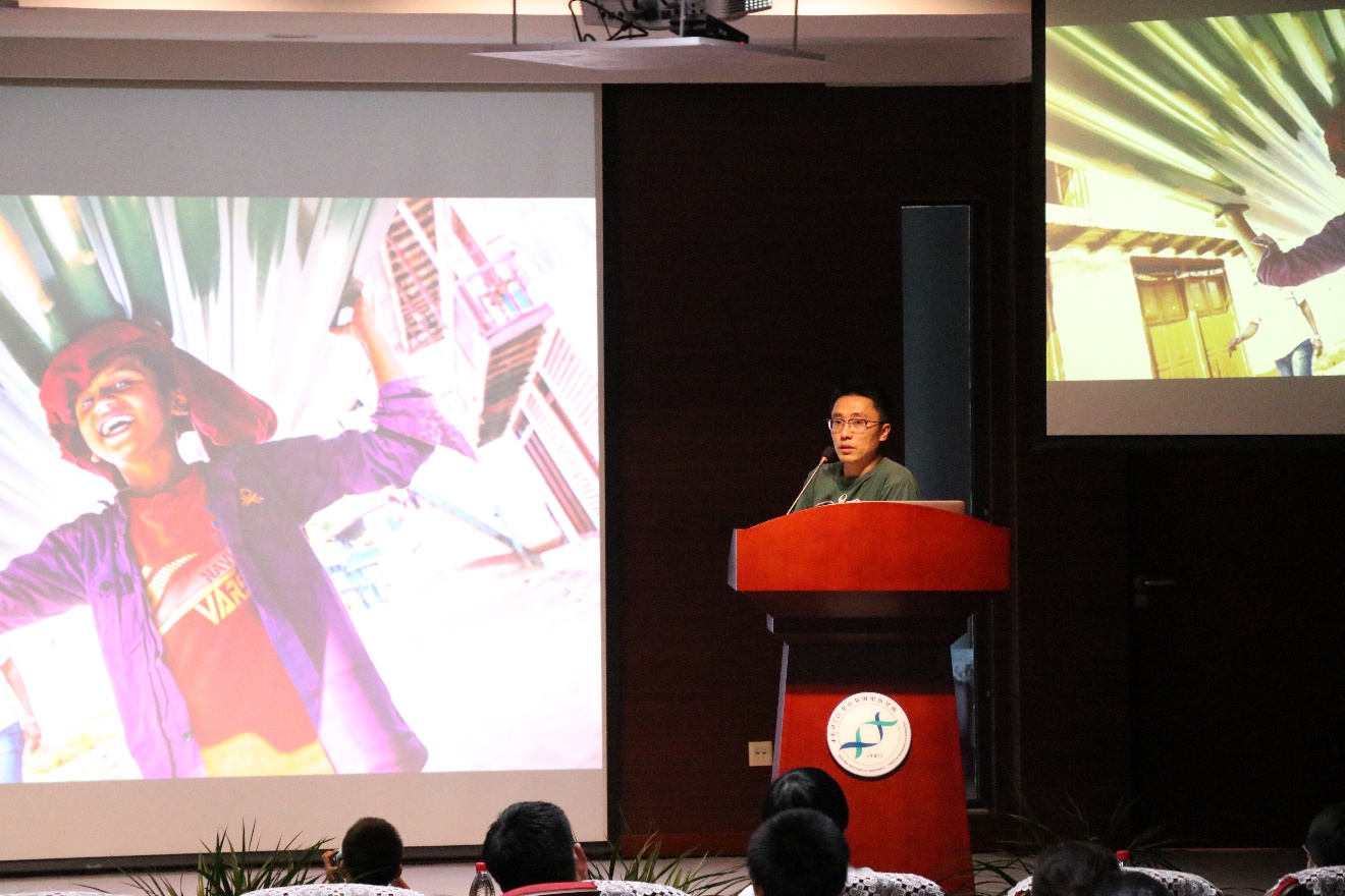 讀書會上,主講人曹毅介紹了自己過去的職業生涯和現在所執迷的事業與興趣。10年中國航天員中心主教員,2年北京基因組研究所職員,如今是自由攝影師,創立自主品牌,多幅作品入圍國際攝影大賽,并獲獎項。曹毅通過自己的一幅幅攝影作品,風趣幽默、深入淺出地分享了尼泊爾的概況、歷史、宗教、藝術、節日,作品攝制過程的想法、思路,作品背后的故事和所見所聞、所思所想,為大家揭開了尼泊爾,這個具有濃厚宗教氛圍、擁有悠久歷史的國度的神秘面紗,也讓我們看到一個特立獨行、有自由思想和獨立精神的攝影師,人生的態度和選擇。曹毅感慨自己的攝影作品隨著閱歷和思考在不斷成熟,也確信因為勇敢和決心,找到了喜歡并適合的人生道路,讓在坐年輕的同學們欽佩和羨慕。報告中,曹毅積極和師生互動,并帶來小獎品致謝;為同學們提交的攝影作品進行點評和指導;回答大家的踴躍提問,現場氣氛溫馨活潑。