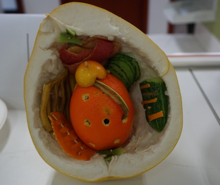 大家的作品里有象征著我們在科研中永遠保持童心的龍貓、有巧妙的利用果皮制作的、變廢為寶的生動形象的小黃人,有象征著勇往直前、不畏艱險,涅槃重生的鳳凰,有長著像皮皮蝦的鯉魚,有維多利亞的秘密、有“三維立體”、展現內部精細結構的細胞等等。