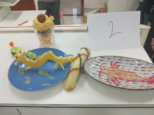 在歡聲笑語中,第二場水果拼盤的活動正式開始了。在水果拼盤的環節中,參賽選手們根據工作人員分發的水果進行構思、雕刻,拼接,每位選手都充分發揮他們的想象力和創造力,用他們靈巧的雙手,展現出他們獨特的作品與風格,讓人嘆為觀止。1小時之后,主持人宣布比賽時間到。選手們停止創作,依次上臺展現他們的作品,并介紹他們的作品名以及寓意。