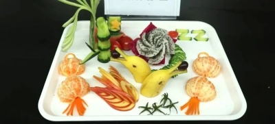 在一陣陣歡聲笑語中,一組組拼盤初現雛形。當26組果香四溢、五彩繽紛、造型精美的水果拼盤呈現在大家眼前時,圍觀的師生不禁贊嘆同學們的巧思妙手,一邊認真觀賞每份作品,一邊聆聽造型設計的講解。這些設計有的造型精巧別出心裁,有的美觀大方飽含寓意。精致的刀法、獨特的審美、考究的擺盤都體現了同學們在制作過程中的用心和細心,更表達了對中國共產主義青年團成立100周年和祖國73歲生日的祝福。