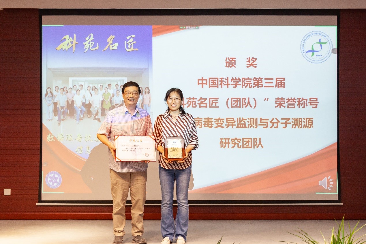 活動開始,所長薛勇彪為獲得中科院第三屆“科苑名匠(團隊)”榮譽的 “新冠病毒變異監測與分子溯源研究團隊”頒發了獎牌證書;黨委書記黃鐵青為被命名為中央和國家機關“四強”黨支部的國家基因組科學數據中心支部和精準基因組醫學重點實驗室第一支部頒發了獎牌。