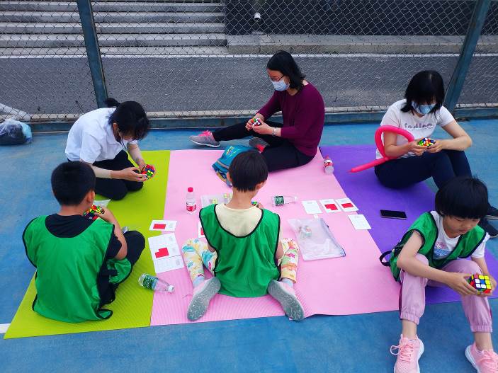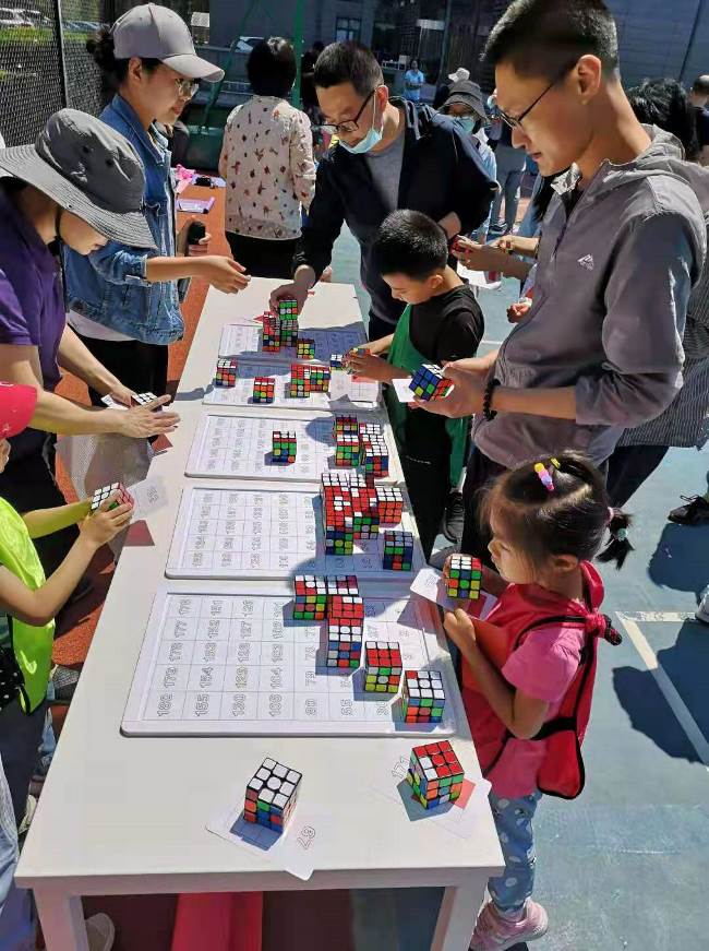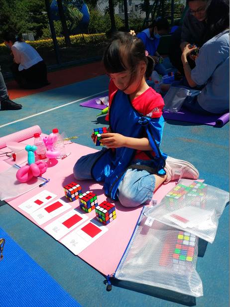 難度最大、也最為有意義的就是“魔力時刻”活動環節了,每個家庭按圖紙進行魔方的圖形拼圖,在所有的家庭的齊心協力下,共同拼出了“我愛你中國”五個紅色大字。